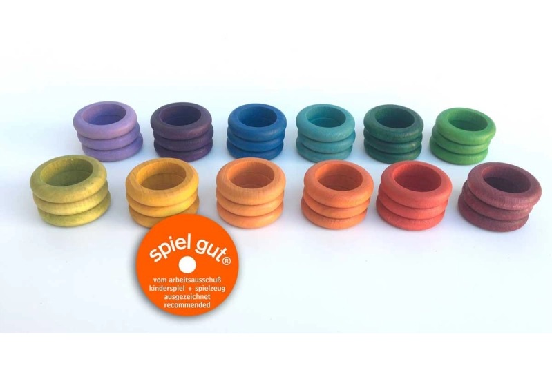 Conjunt d’anelles de fusta tenyides en els colors de l’arc de Sant Martí i de textura suau i llisa. Les anelles són un material de joc ideal per a totes les edats i per la seva senzillesa, ofereixen una infinitat de maneres d’exploració.