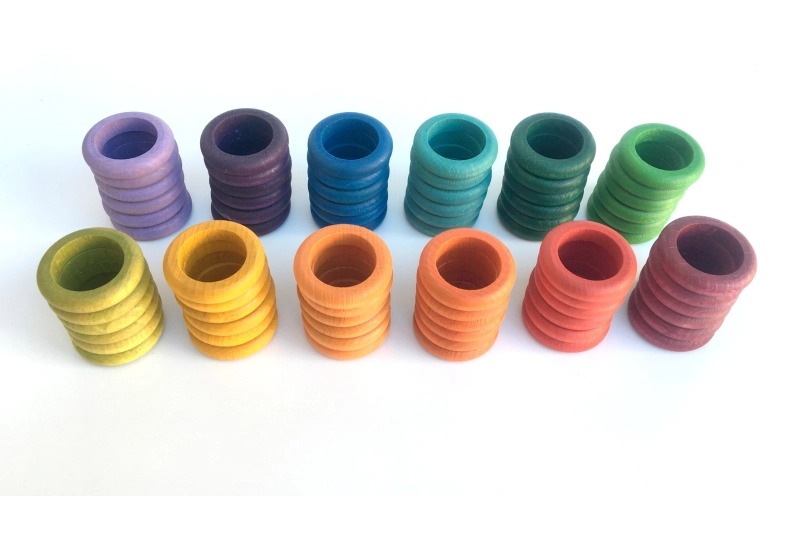 Conjunt d’anelles de fusta tenyides en els colors de l’arc de Sant Martí i de textura suau i llisa. Les anelles són un material de joc ideal per a totes les edats i per la seva senzillesa, ofereixen una infinitat de maneres d’exploració.
