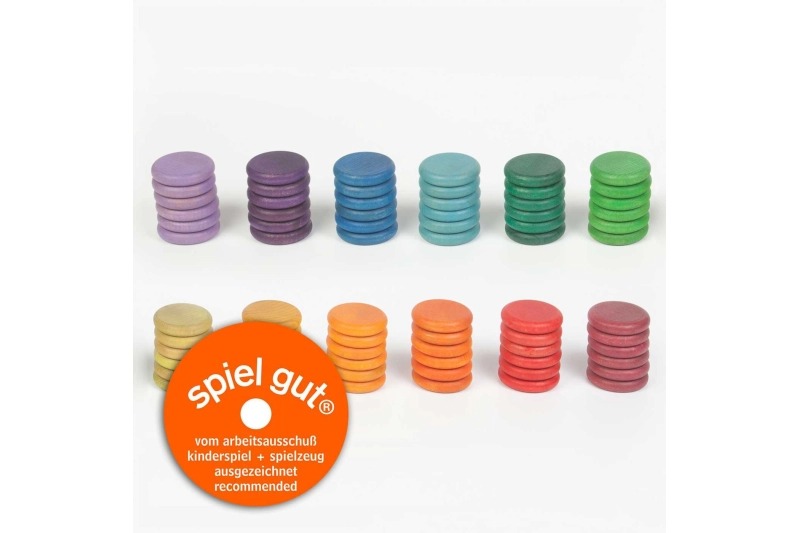 Conjunt de monedes de fusta tenyides en els colors de l’arc de Sant Martí i de textura suau i llisa. Les peces circulars són un material de joc ideal per a totes les edats i per la seva senzillesa, ofereixen una infinitat de maneres d’exploració.