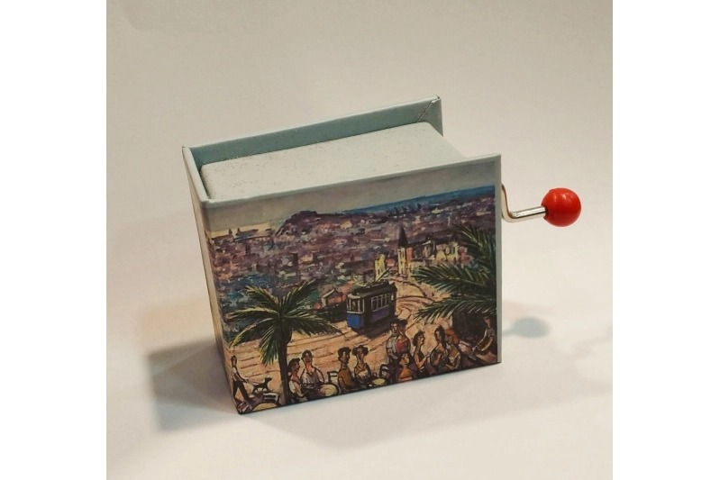 Aquest mecanisme musical de 18 làmines amb maneta es presenta en una capsa de cartó il·lustrada en forma de llibret.
