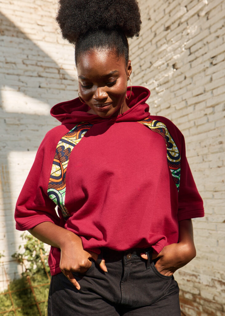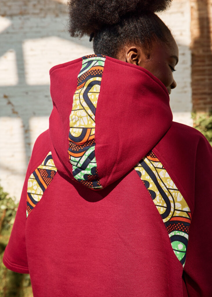 Dessuadora crop de cotó amb caputxa en color granat i detalls de disseny en teixit wax. Màniga 3/4.