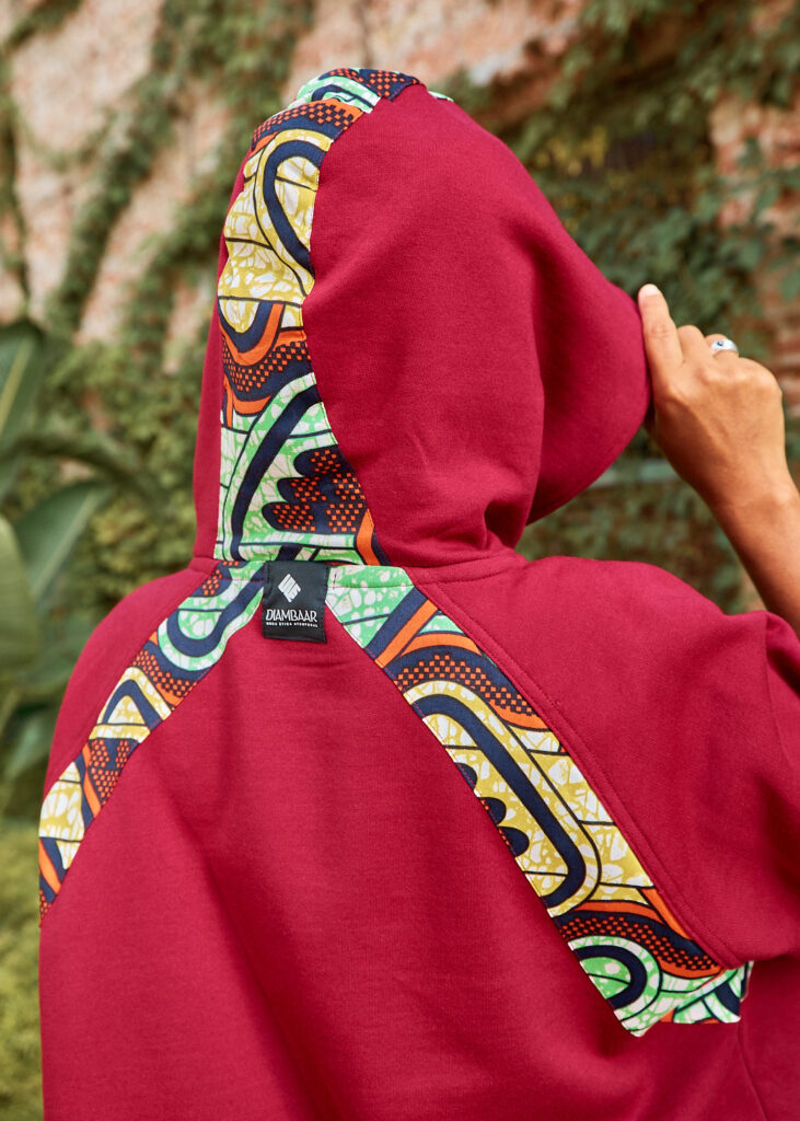 Les dessuadores de Diambaar està confeccionada amb teixits de cotó 100% de comerç local i els teixits wax (africà) també de cotó provenen del Senegal. Són de gran qualitat que donen una alta durabilitat i comoditat.