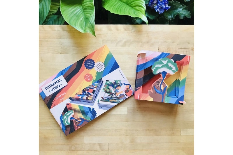 Diorames LGTBIQ+ és un quadern que et permetrà muntar amb les teves pròpies mans tres escenes del col·lectiu. La primera tracta sobre la bandera LGTBIQ+, la seva història i simbologia; la segona és de la vida i repercussió de Frida Kahlo; la tercera parla sobre com va sorgir el Dia de l’Orgull.