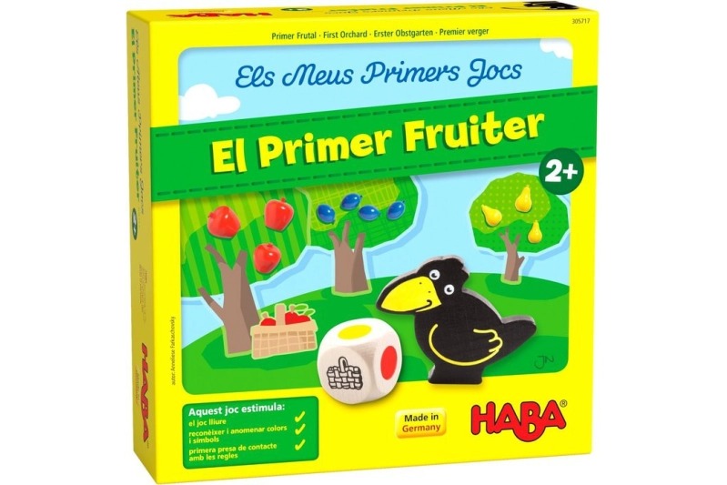Inclou: Quatre arbres de cartró gruixut i resistent, setze precioses fruites de colors (pomes, peres, cireres i prunes), un cistell, un dau de fusta, un corb de fusta, cinc peces de camí de cartró gruixut i resistent i les instruccions.