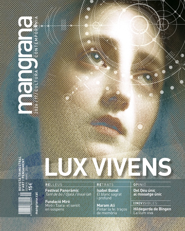A la secció Retrats, artistes com Maya Inès Touam, Isabel Banal i Maram Ali exploren la fe des de pràctiques visuals que convoquen el silenci, la memòria, el cos, la resistència i el gest creatiu. El número es completa amb una peça d’opinió que reflexiona sobre el pas del Déu únic al missatge únic, i amb la recuperació d’Hildegarda de Bingen a (In)visibles, com a veu clau d’una espiritualitat lluminosa i no dogmàtica.