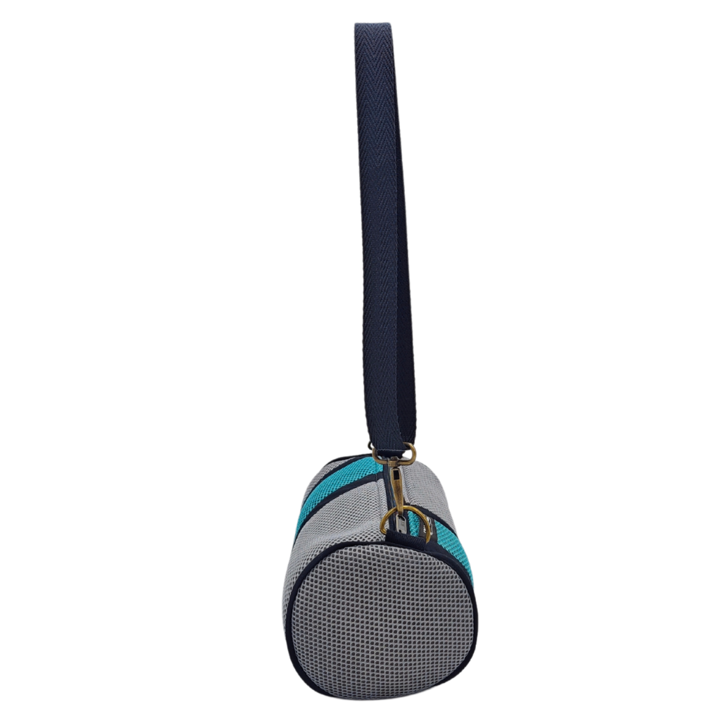 Material: Aquesta Mini Bossa està feta a mà per dones que nosaltres formem al nostre Programa Social. És un producte confeccionat amb teixit tècnic 3D i a l'interior està forrada amb loneta impermeable reciclada.