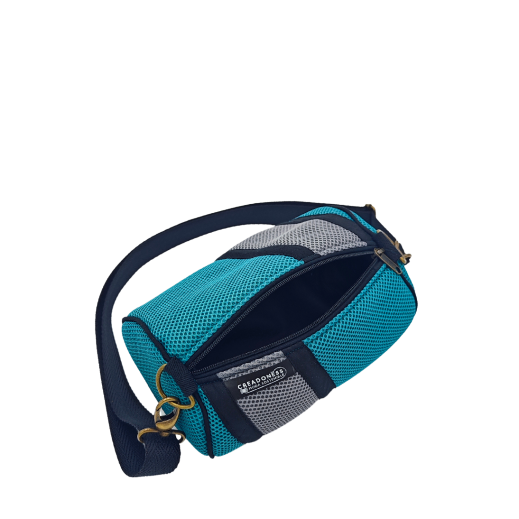 Material: Aquesta Mini Bossa està feta a mà per dones que nosaltres formem al nostre Programa Social. És un producte confeccionat amb teixit tècnic 3D i a l'interior està forrada amb loneta impermeable reciclada.