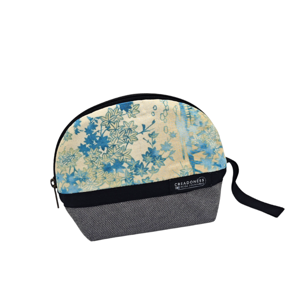 Material: Aquest necesser petit està fet a mà per les dones que formem en el Programa Social de Creadoness. Està confeccionat amb una suau loneta de cotó bicolor, amb la característica de ser antimanchas. A l'interior està forrat amb popelí negre.
