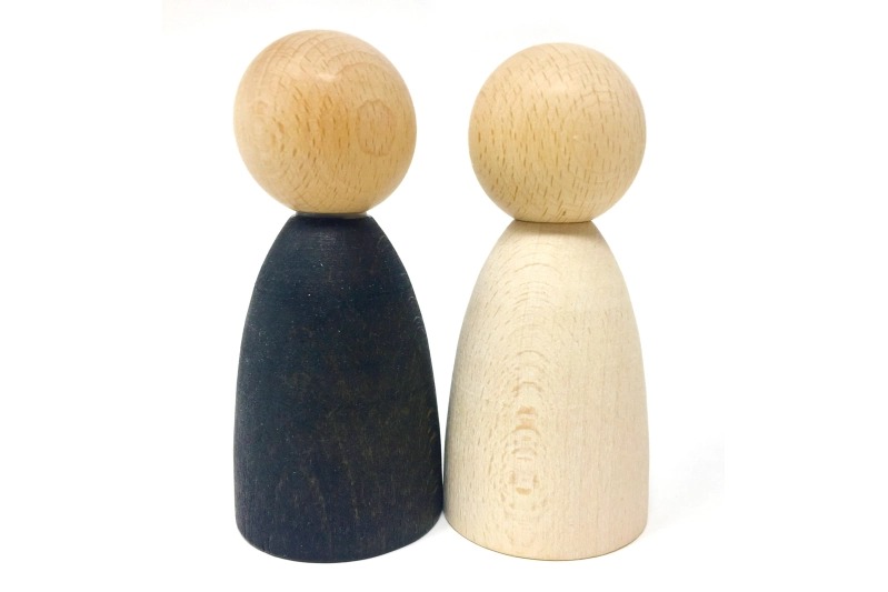 2 nins grans, en dues fustes diferents que poden ajudar als infants a connectar amb la idea de les diferències en el color de la pell. Al mateix temps, la grandària permet considerar diferents generacions.