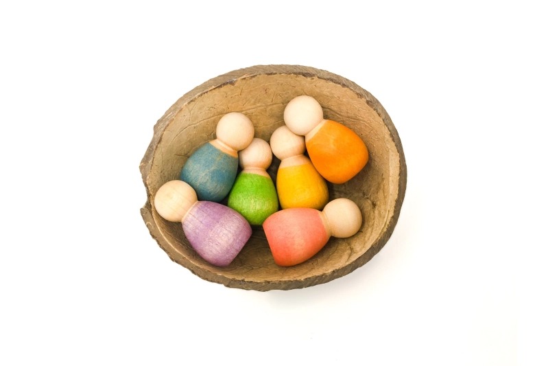 Els tints són amb base aigua i no tòxics que compleixen la normativa europea de la seguretat de la Joguina EN/71-3:2014 + A1:2014 / 2013. Treballar amb tints i no amb pintures acríliques permet seguir tenint contacte amb la fusta que és noble i amable. El dibuix de la veta, els seus matisos i tactes, les seves característiques pròpies. El tint no salta de la fusta quan aquesta cau al terra o quan el temps passa perquè penetra molt endins de la peça. Alguna vegada pot ocórrer que per un excés de pigments alguna peça perdi una mica de color en entrar en contacte amb la saliva, no hi ha problema, són absolutament segures i no tòxiques.