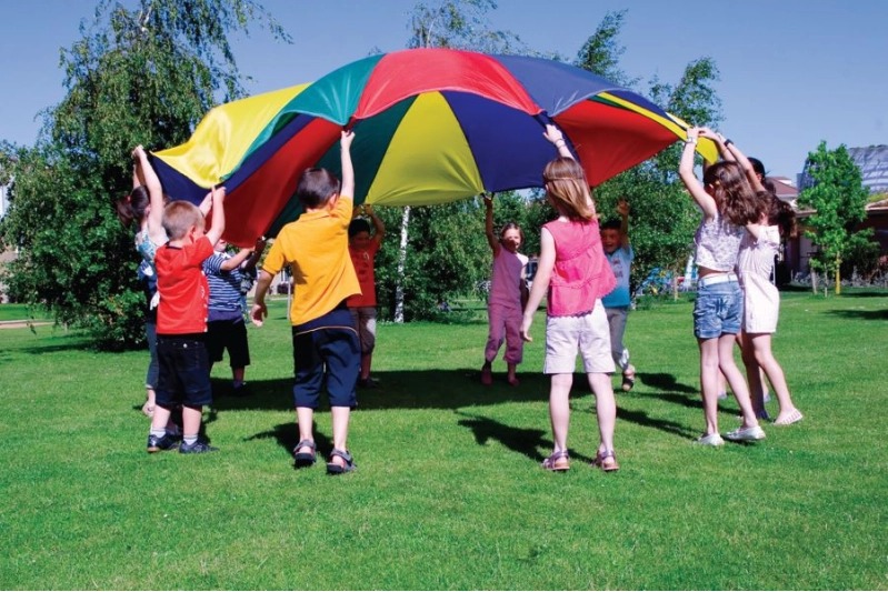 Els jocs amb el paracaigudes proporcionen la màxima participació per part de tots els membres del grup. El comportament físic d’un paracaigudes en moviment comporta que la cooperació sigui una necessitat. Un cercle manté a tots els membres del grup en peu d’igualtat. El cercle és la forma més cooperativa de comunicació del grup.