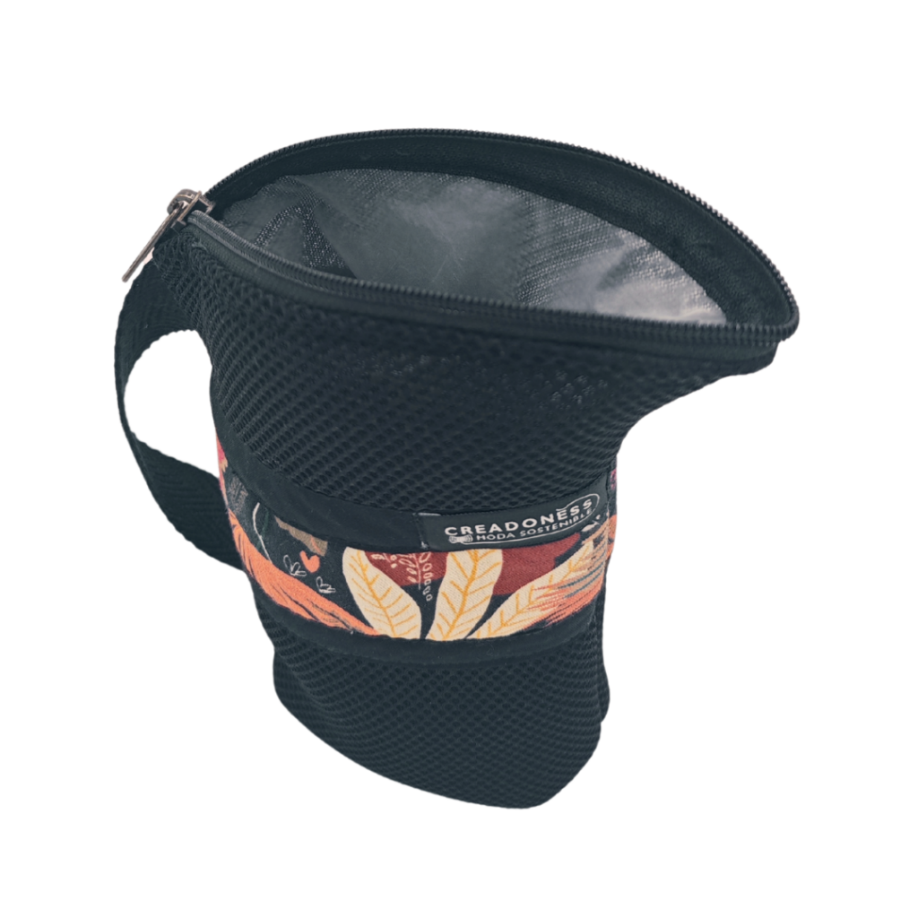 Material: Aquesta Yerbera està feta a mà a Barcelona amb teixit tècnic 3D. A l'interior té un revestiment alimentari, apte per conservar aliments secs. És molt lleugera i, per la seva tipologia de disseny, té un bec abocador.